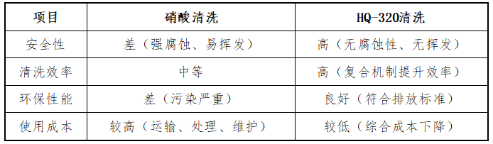 針對硝酸清洗在安全、環(huán)保、設(shè)備腐蝕等方面的弊端,合肥華清高科研發(fā)的 HQ-320環(huán)保清洗劑通過多維度技術(shù)創(chuàng)新,實現(xiàn)對硝酸清洗的全面替代,其核心突破如下: