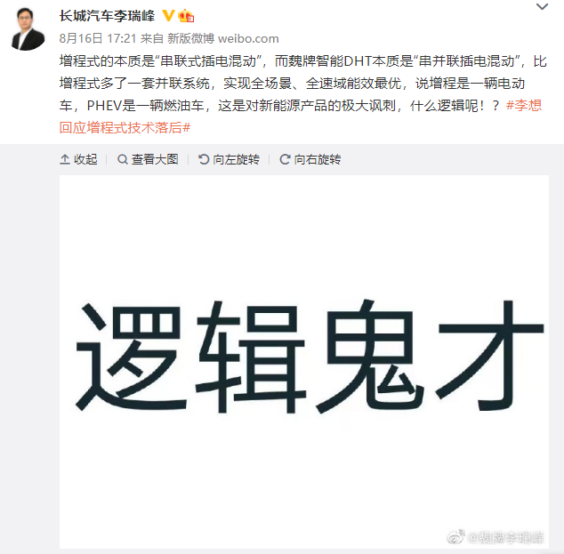此前,長城汽車?yán)钊鸱灏l(fā)布微博,就增程式和插電式混合動力發(fā)表觀點(diǎn)。他表示,增程式的本質(zhì)是“串聯(lián)式插電混動”,而魏牌智能DHT本質(zhì)是“串并聯(lián)插電混動”,比增程式多了一套并聯(lián)系統(tǒng),實(shí)現(xiàn)全場景、全速域能效最優(yōu),說增程式是一輛電動車,PHEV是一輛燃油車,這是對新能源產(chǎn)品的極大諷刺,什么邏輯呢?。客瑫r他配上了#李想回應(yīng)增程式技術(shù)落后# 的話題,并附圖“邏輯鬼才”一張。
