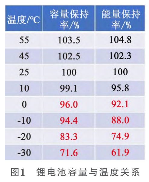 鋰離子電池最適宜的工作溫度是15~30℃,40℃以上要主動放熱,0℃以下要加溫。從鋰電池機理上看,造成鋰離子電池低溫性能差的主要原因是隨著環(huán)境溫度的降低,電解液及電極界面膜對鋰離子轉(zhuǎn)移阻抗增大,此時Li+的遷移和負(fù)極碳隙的嵌入將變得十分困難,充放電性能因此變差(圖2),極端低溫情況甚至?xí)霈F(xiàn)電解液凍結(jié)、電池?zé)o法放電等現(xiàn)象,此類低溫容量損耗(-30℃以下)占電池總電量的19\%左右。
