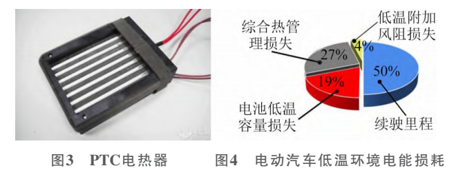電動汽車熱空調(diào)采用PTC電加熱器(圖3),其特點是功率大、制熱速度快,主流的暖風(fēng)空調(diào)功率在3~6kW,暖風(fēng)1h需耗費3~6度電。以特斯拉Mod-elY為例,其百公里耗電大概13度電(kWh)左右,加熱系統(tǒng)的額外耗電及其綜合熱管理損失,使汽車?yán)m(xù)航能力下降幅度可達27\%左右,再加上低溫衰減的影響,實際的續(xù)航里程衰減可能要達到40\%~50\%(圖4)。