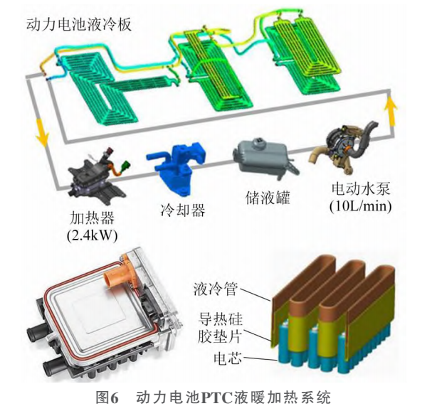 以空氣為介質(zhì)的風(fēng)暖因?qū)﹄姵亟M加熱不均勻而逐漸被淘汰,以液體為介質(zhì)的加熱均勻度較好,且可以利用電機、電機控制器、DC/DC產(chǎn)生的余熱幫助電池達到工作溫度,所以PTC液熱系統(tǒng)逐漸成為當(dāng)前空調(diào)及動力電池加熱(圖6)的主流技術(shù),但此種方式耗電量大也是新能源汽車的一個痛點。目前在電池本身耐低溫性能沒有突破的情況下,采取的措施是提高電能的制熱效率。