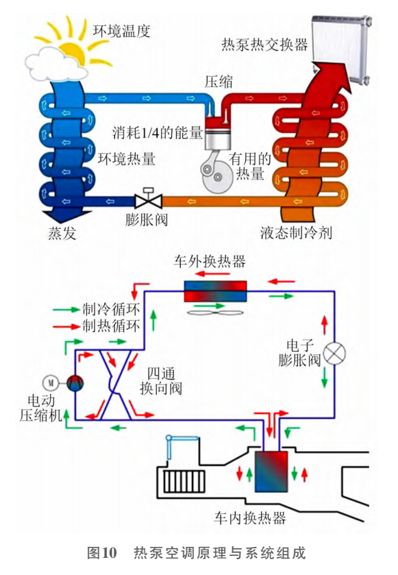 汽車熱泵空調(diào)系統(tǒng)在處于采暖循環(huán)時,車外換熱器作為蒸發(fā)器使用,吸收外界環(huán)境的熱量,高溫高壓的制冷劑流過熱泵熱交換器時,制冷劑釋放的熱能用于加熱乘客艙。熱泵通過搬運環(huán)境的熱量,使得采暖系統(tǒng)效率達到1.3~2.0,節(jié)省30\%~50\%的空調(diào)功耗,測試表明:在-7℃時,R134a熱泵相較于PTC制熱可提升20\%續(xù)航里程。