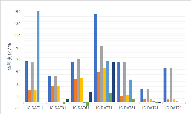 標(biāo)準(zhǔn)橡膠配方在這些液體中浸泡后的體積變化表明,大多數(shù)被測橡膠配方都有明顯的變化。可以看出,在所有的被測材料中,只有代碼為IC-DAT41的配方才是合適的候選配方。