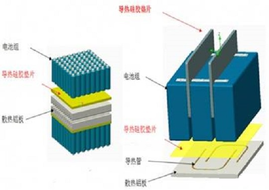 1、此類電池組空間大,與空氣接觸良好,裸露部分能通過空氣自然換熱,底部不能自然換熱部位通過散熱器散熱,導(dǎo)熱硅膠片填充散熱器與電池組中間空隙,導(dǎo)熱、減震、絕緣。