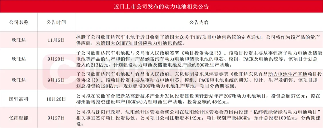 二線電池廠商近日動(dòng)輒大手筆,一擲千金。據(jù)財(cái)聯(lián)社不完全統(tǒng)計(jì),欣旺達(dá)先后公告共投資333億元建設(shè)生產(chǎn)基地,并將為德國(guó)大眾HEV項(xiàng)目供應(yīng)動(dòng)力電池包系統(tǒng);國(guó)軒高科和億緯鋰能分別公告擬115億元、100億元投建相關(guān)項(xiàng)目。