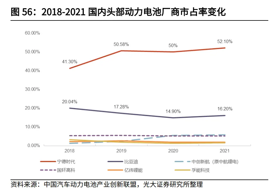 光大證券分析師劉凱等10月27日發(fā)布的研報(bào)指出,在龍頭格局趨于穩(wěn)定的同時(shí),國(guó)內(nèi)國(guó)軒高科、億緯鋰能、中航鋰電、蜂巢能源等二線電池廠商逐步切入,總體裝機(jī)量與市場(chǎng)份額上升,內(nèi)部競(jìng)爭(zhēng)空前激烈。