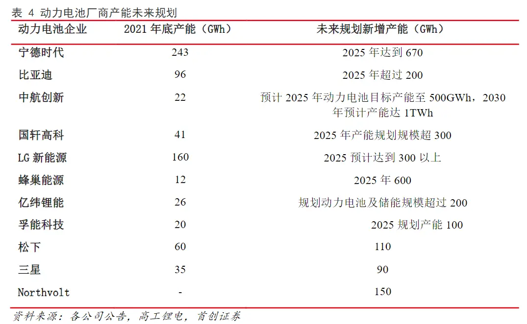 寧德時(shí)代已披露產(chǎn)能規(guī)劃超過(guò)670GWh;比亞迪已公布電池產(chǎn)能規(guī)劃超過(guò)200GWh;蜂巢能源規(guī)劃2025年實(shí)現(xiàn)600GWh電池產(chǎn)能,出貨量450GWh;中創(chuàng)新航預(yù)計(jì)2025年動(dòng)力電池目標(biāo)產(chǎn)能至500GWh,2030年預(yù)計(jì)產(chǎn)能達(dá)1TWh;國(guó)軒高科、億緯鋰能、孚能科技2025年產(chǎn)能規(guī)劃目標(biāo)分別為300GWh、200 GWh(包括儲(chǔ)能)、100 GWh。
