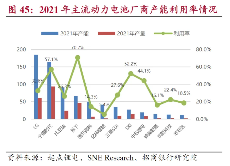 但從產(chǎn)能利用率數(shù)據(jù)來(lái)看,二線廠商顯著低于頭部廠商,其中中航鋰電(44.1\%)處于前列,孚能科技(22.4\%)、欣旺達(dá)(18.5\%)、蜂巢能源(16.1\%)、國(guó)軒高科(14.3\%)、億緯鋰能(5.4\%)則遜色不少。