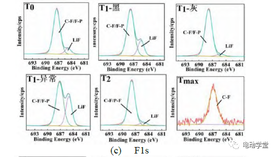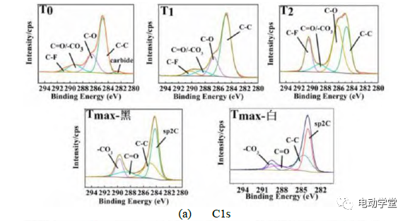 在Tmax狀態(tài)下,正極表面主要存在較厚的界面膜、石墨化的C-C、-CO3、C-F等物質(zhì)。由此可知,磷酸鐵鋰正極和負極均在T0狀態(tài)下疑似已經(jīng)發(fā)生了副反應,但相比于負極材料,正極材料在熱失控狀態(tài)下安全性更加穩(wěn)定,這也和磷酸鐵鋰材料本身特性有關(guān)。