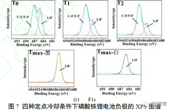 圖7(c)為四種定點冷卻條件下磷酸鐵鋰電池負極的F1sXPS圖譜。在溫度達到T0時,負極表面的F存在C-F、F-P、LiF三種形式,其中,C-F代表著含氟有機物的生成;F-P代表殘留電解質(zhì)鹽LiPF6的存在以及相應分解產(chǎn)物PFx的存在。