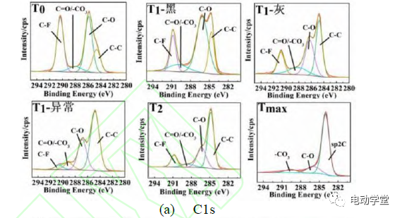 從溫度達到Tmax的電池來看,負極表面無法檢測到C-F、C=O,-CO3占比明顯增加,超過C-O,C-C占比大幅減小,新出現(xiàn)sp2C,且sp2C所占含量最多。由此可見,完全熱失控后,C-F組分推測可能主要是小分子,均噴出了電池外,離開了負極表面。C=O進一步反應徹底轉(zhuǎn)換成了-CO3、C-O。