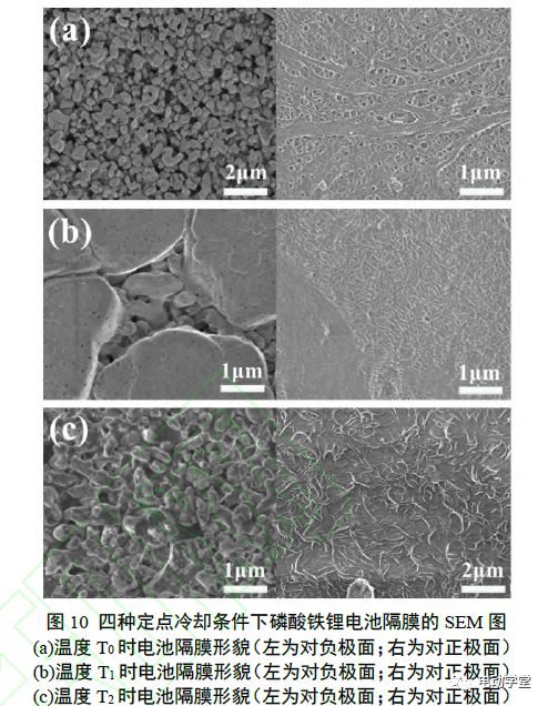 圖8顯示了四種定點冷卻條件下磷酸鐵鋰電池正極的SEM圖。電池開始自發(fā)熱時,電池正極表面可觀察到活性材料顆粒,且表面覆蓋沉積物,推測來自于電解液分解產(chǎn)物。