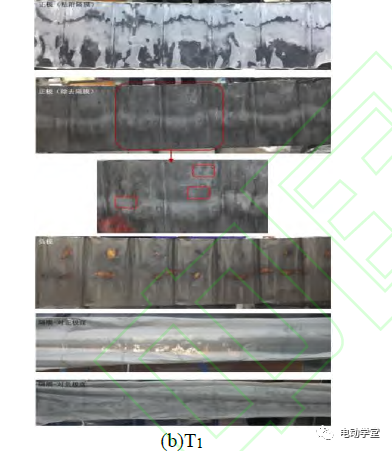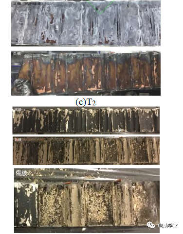 金色區(qū)域代表負極為嵌鋰態(tài),黑色區(qū)域的出現(xiàn)表明在T1狀態(tài)下電池發(fā)生內(nèi)短路,導致負極局部發(fā)生快速脫鋰。而分離出的隔膜雖然仍基本完整,但已存在一定程度的拉伸變形。表明在T1溫度下,隔膜發(fā)生一定程度的收縮,導致電池發(fā)生內(nèi)短路。