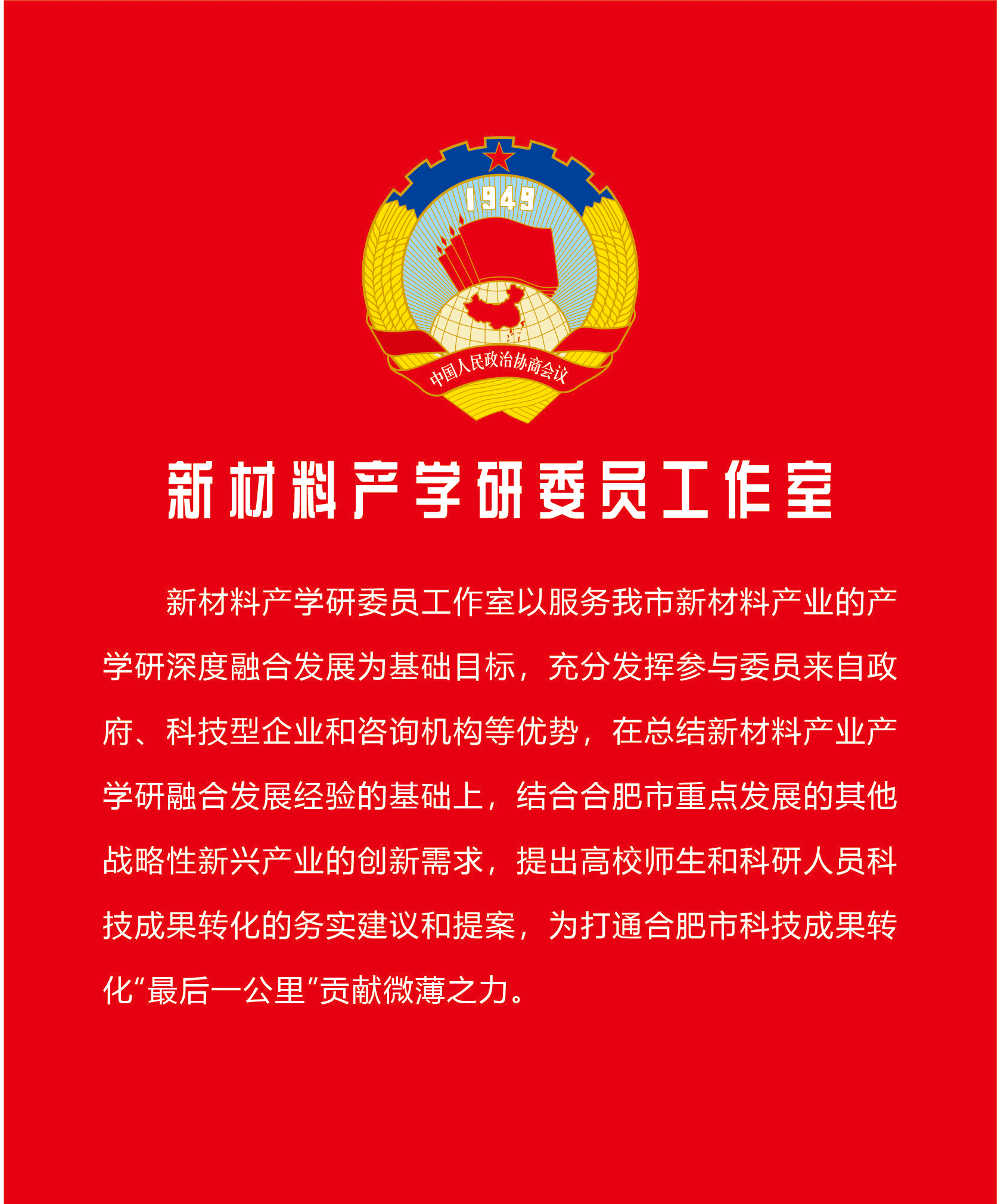 為進一步推動合肥新材料產(chǎn)業(yè)發(fā)展,由合肥市政協(xié)牽頭,以合肥華清表面處理基地為示范平臺,成立合肥新材料產(chǎn)學研委員工作室。合肥新材料產(chǎn)學研委員工作室將以服務合肥市新材料產(chǎn)業(yè)的產(chǎn)學研深度融合發(fā)展為基礎目標,充分發(fā)揮參與委員來自政府、科技型企業(yè)和咨詢機構等優(yōu)勢,通過和中國科技大學、合肥工業(yè)大學和安徽大學等高校師生的互動,專注服務高校師生參與的中小型科技型企業(yè)和企業(yè)家、服務創(chuàng)新創(chuàng)業(yè),從技術研發(fā)、科技成果轉化(特別是產(chǎn)品的中試環(huán)節(jié))、初創(chuàng)科技企業(yè)管理、科技企業(yè)投融資、科技人才引進和激勵等不同角度,以多種方式為本市科技型中小企業(yè)發(fā)展助力。在總結新材料產(chǎn)業(yè)產(chǎn)學研融合發(fā)展經(jīng)驗的基礎上,結合合肥市重點發(fā)展的其他戰(zhàn)略性新興產(chǎn)業(yè)的創(chuàng)新需求,提出高校師生和科研人員科技成果轉化的務實建議和提案,為打通合肥市科技成果轉化"最后一公里"貢獻微薄之力。