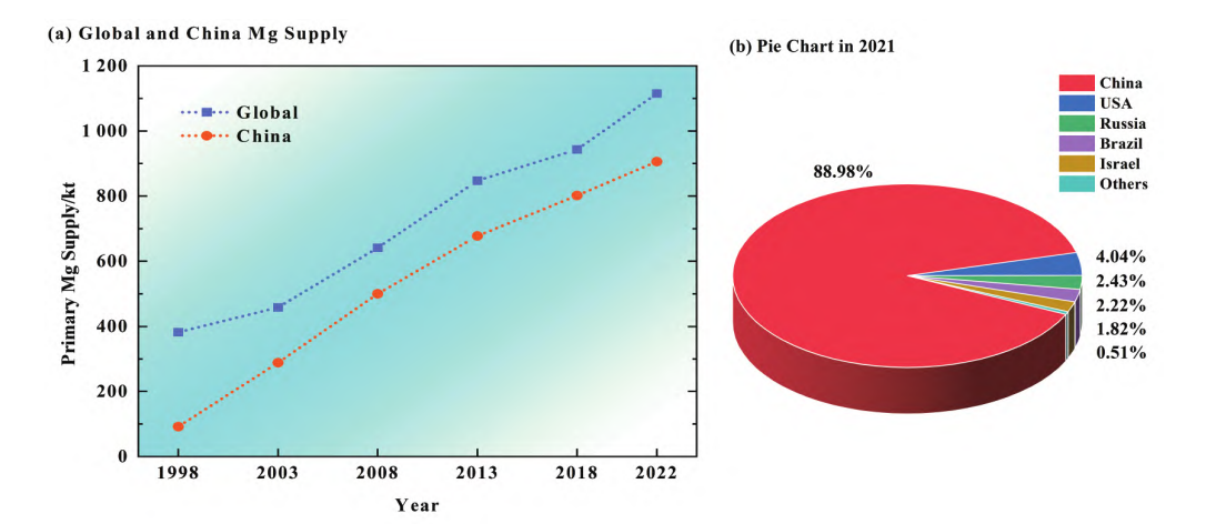 圖2 全球和中國原鎂產(chǎn)量:(a)1998年至今全球和中國的原鎂供應(yīng)量;(b)2021年主要國家供應(yīng)量占比圖
