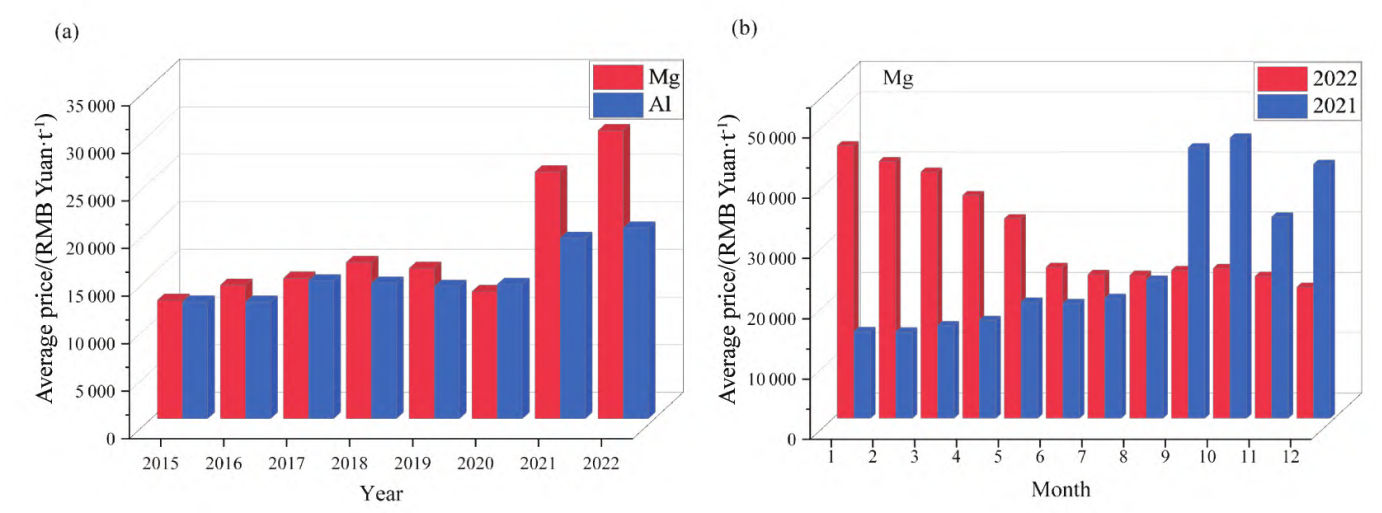 圖3 中國鎂錠價格波動較大:(a)2015—2022年中國鎂錠與鋁錠年度平均價格;(b)2021年和2022年鎂錠月度平均價格