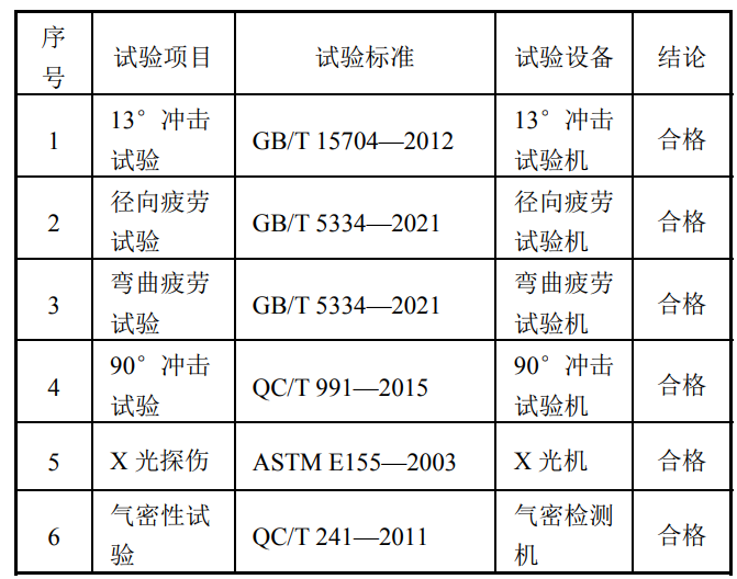 使用已有車型規(guī)格的鎂合金車輪進(jìn)行臺架試驗(yàn)和整車道路試驗(yàn),驗(yàn)證鎂合金車輪強(qiáng)度是否滿足開發(fā)要求,試驗(yàn)條件嚴(yán)苛度不低于量產(chǎn)鋁合金車輪,試驗(yàn)結(jié)束后,鎂合金車輪未出現(xiàn)裂紋、變形等現(xiàn)象則判斷合格。