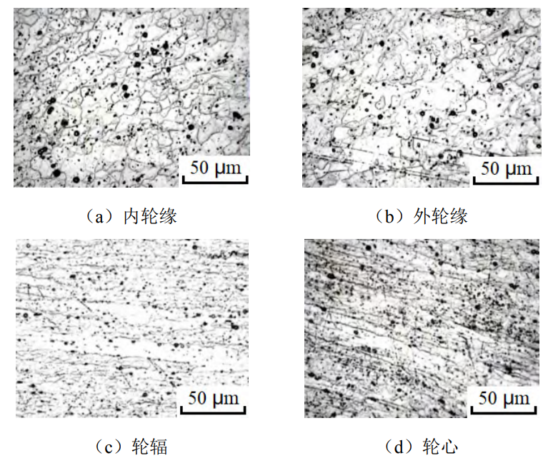 合金車輪不同部位金相組織切片,結(jié)果顯示,鎂合金內(nèi)部析出晶粒細(xì)小,且均勻地分布于晶體的晶界處,金相組織沒有出現(xiàn)聚集偏析現(xiàn)象。