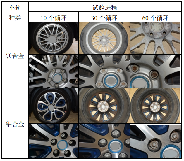使用已有車型規(guī)格鎂合金車輪進(jìn)行臺架試驗(yàn)和整車腐蝕試驗(yàn),驗(yàn)證鎂合金車輪防腐能力是否滿足整車開發(fā)要求,試驗(yàn)條件嚴(yán)苛度不低于量產(chǎn)鋁合金車輪,試驗(yàn)結(jié)束后鎂合金車輪未出現(xiàn)氣泡、涂層脫落、周邊零部件連接區(qū)域及螺母安裝孔區(qū)域掉塊或車輪螺母無法拆卸的現(xiàn)象則判斷合格。