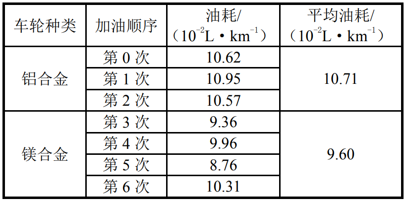 對采用原裝配鋁合金車輪的燃油車和更換為同規(guī)格鎂合金車輪的燃油車進(jìn)行實(shí)車路試,在市區(qū)測試 6 天累計(jì)運(yùn)行 2800 km,試驗(yàn)數(shù)據(jù)見表 5, 后者相比前者百公里油耗降低 10.36%。