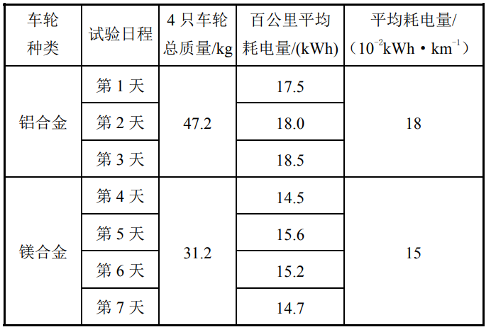 對分別配備鋁合金和鎂合金車輪的另一款純 電動車進(jìn)行實(shí)車路試,在市區(qū)測試 7 天,試驗(yàn)數(shù) 據(jù)見表7,后者相比前者整車減重 16 kg,平均百公里耗電量降低 16.67%。