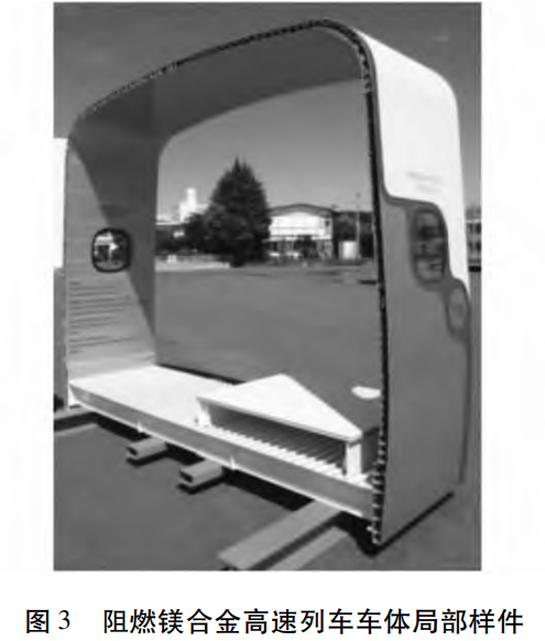 日本新一代高速列車 FASTECH360 的原型車部分結(jié)構(gòu)采用了 2017年發(fā)明的新型阻燃鎂合金材料,現(xiàn)在已經(jīng)完成了局部車體樣件的制備,這種新的鎂合金車體與原來鋁合金車體相比能夠?qū)崿F(xiàn)減重25%。阻燃鎂合金高速列車車體局部樣件如圖3所示。對推動鎂合金材料在軌道交通領(lǐng)域的應(yīng)用具有促進(jìn)作用。