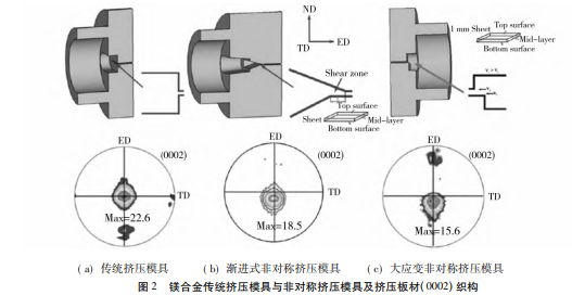 鎂合金擠壓型材生產(chǎn)具有可連續(xù)、加工簡單等優(yōu)點(diǎn)。鎂合金由于塑性變形能力差,變形加工困難,并且鎂與鋼鐵的親和力低,所以鎂合金型材擠壓加工后擠壓墊與材料壓余能夠分離,擠壓過程中不需要對墊片進(jìn)行潤滑。在生產(chǎn)空心型材時(shí),需要應(yīng)用平面分流組合模具。擠壓成形過程中,擠壓機(jī)對錠坯施力,金屬經(jīng)分流孔分為金屬流然后在焊合室焊合,焊合后的金屬在上模和下模間的空隙中流出,最后形成空心型材。如果鎂合金型材的形狀是對稱、截面,在設(shè)計(jì)鎂合金擠壓分流組合模時(shí),模具的中心要和型材的截面質(zhì)心重合。在設(shè)計(jì)平面分流組合模時(shí),組合模的上模包含分流孔、分流橋、模芯等部分,其中分流孔是焊合室的通道,分流橋?qū)崿F(xiàn)模芯的支撐,模心的主要作用是保證鎂合金型材的形狀和內(nèi)腔尺寸的成形。組合模的下模包含焊合室和模孔等結(jié)構(gòu)。其中在焊合室中經(jīng)分流孔分開的金屬流重新焊合在一起,然后經(jīng)由??仔纬刹煌螤?、外部尺寸的鎂合金型材。在非對稱擠壓模具設(shè)計(jì)方面,楊青山等人通過改變鎂合金型材擠壓模具的內(nèi)腔結(jié)構(gòu),從而改變鎂合金在擠壓過程中的金屬流速差。由于鎂合金流速存在差值,從而在型材不同方向形成剪切應(yīng)力,這些剪切應(yīng)力使鎂合金的晶粒取向發(fā)生改變,從而改善了擠壓鎂合金板材的基面織構(gòu),并由此提出鎂合金漸進(jìn)式非對稱擠壓和大應(yīng)變非對稱擠壓工藝,鎂合金傳統(tǒng)擠壓模具與非對稱擠壓模具及擠壓板材(0002) 織構(gòu)如圖 2 所示。