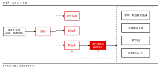 鎂金屬產(chǎn)業(yè)鏈上游環(huán)節(jié)主要是將自然界中各種形式存在的鎂提純加工成原鎂,中游制造環(huán)節(jié)則是將原鎂加工處理,以待實際應(yīng)用,加工方式包括制造鎂合金、金屬還原、煉鋼脫硫等。