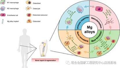 對于骨愈合的成功,良好的免疫微環(huán)境調(diào)控、血運重建和骨重塑是非常關(guān)鍵的。在骨愈合的過程中,炎癥、修復(fù)和重塑是連續(xù)而部分重疊的三個階段。不同譜系的細胞,包括免疫細胞、成血管相關(guān)細胞、成骨細胞、骨細胞和破骨細胞等,依次參與其中。鎂合金能夠以不同的方式與這些細胞相互作用,從而實現(xiàn)對骨愈合的全面調(diào)控。圖1展示了這種相互作用的概述。因此,這篇綜述從免疫調(diào)控、血管再生、成骨和破骨細胞功能調(diào)控四個方面系統(tǒng)地總結(jié)了鎂合金在骨愈合機制中的作用。通過深入了解這些機制,我們可以更好地理解鎂合金在骨修復(fù)中的作用,并為進一步的研究和臨床應(yīng)用提供方向和指導(dǎo)。