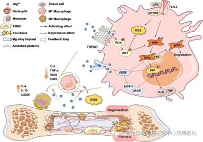 鎂合金在免疫反應(yīng)中,特別是巨噬細胞的極化行為上具有雙向調(diào)控的作用。在植入早期,鎂合金參與了一系列炎癥活化過程,包括蛋白吸附、炎癥細胞募集、單核細胞分化、巨噬細胞M1表型極化和吞噬作用等。當(dāng)鎂合金降解穩(wěn)定后,適當(dāng)釋放的鎂離子、氫氧根和氫氣可以促進巨噬細胞向M2表型極化轉(zhuǎn)變,從而創(chuàng)造出有利于組織再生的抑炎免疫微環(huán)境。在這個過程中,TRPM7/PI3K/AKT1s、TLR-4/MYD88/NF-κB等信號通路的活化起到了關(guān)鍵作用。在良好的免疫微環(huán)境塑造下,M2型巨噬細胞與間充質(zhì)干細胞等骨愈合相關(guān)細胞相互作用,促進骨再生,并參與缺損部位的血管再生過程。圖2展示了鎂合金通過調(diào)控巨噬細胞極化來塑造骨愈合微環(huán)境的作用及其潛在機制。通過了解這些調(diào)控機制,我們可以更好地利用鎂合金來促進骨愈合,并為臨床應(yīng)用提供更多的可能性。