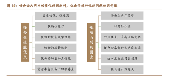 由于鎂合金替代鋁合金以及鋼鐵部件存在部分瓶頸和制約因素,可能導(dǎo)致鎂 合金替代不及預(yù)期,主要瓶頸和制約因素如下: