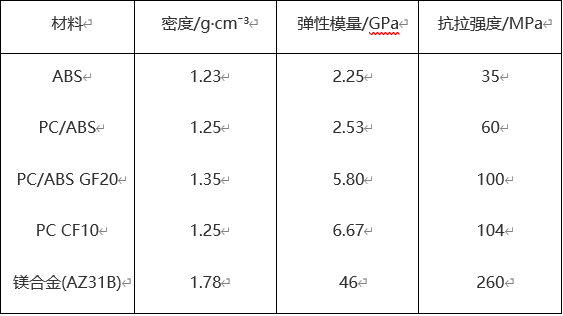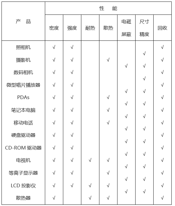 鎂合金具有密度小、比強(qiáng)度和比剛度高、優(yōu)良的耐沖擊性能等優(yōu)點(diǎn),因此成為制作電子器件殼體的理想材料之一。下表列出了各種外殼材料的性能對(duì)比: