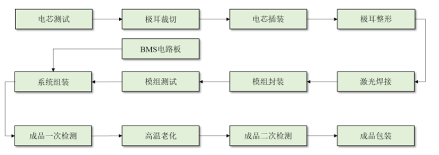 在系統(tǒng)組裝工段:經(jīng)檢驗(yàn)合格的電池模組與BMS電路板等組裝成系統(tǒng)成品,然后經(jīng)一次檢測(cè)、高溫老化和二次檢測(cè)等工序后進(jìn)入成品包裝環(huán)節(jié)。具體如下圖所示: