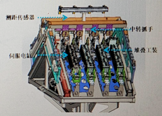 (1)電芯堆疊:該工序是制備模組的第一道工序。將檢測(cè)合格后的成品電芯與側(cè)板、端板、蓋板、連接片等組件進(jìn)行配對(duì)上線,然后將電芯根據(jù)一定的串并聯(lián)順序進(jìn)行堆疊。